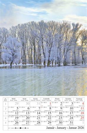 -naptár rész: magyar, angol, német nyelven, magyar  ünnepek  és névnapokkal, napkelte, napnyugta és holdállás  feltüntetésével